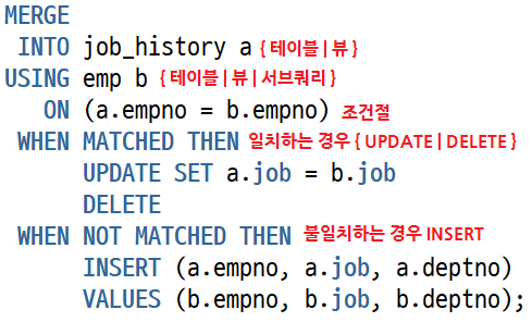 단일(자신의) 테이블에 MERGE 문은 자주 사용하므로 꼭 기억해 두는 것이 좋다. USING 절에 테이블 대신 dual을 사용하면 된다. ON 조건절이 일치하면 UPDATE, 불일치하면 INSERT를 하는 쿼리이다.
