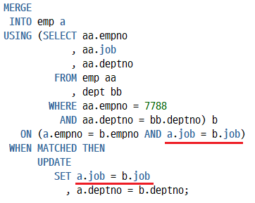 서브쿼리의 결과와 조인하여 MERGE 문을 사용할 수 있다.